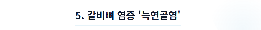 가슴뼈와 갈비뼈가 만나는 부위에 염증이 생긴 경우예요. 가슴 중앙 부근을 손가락으로 눌렀을 때 심한 통증이 느껴진다면 늑연골염을 의심해볼 수 있어요. 숨을 깊게 들이마시거나 기침할 때, 무거운 것을 들 때 통증이 심해지는 특징이 있답니다.