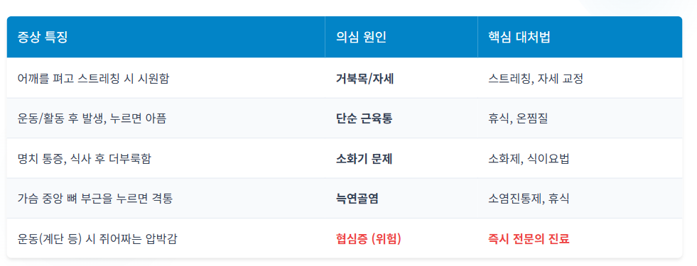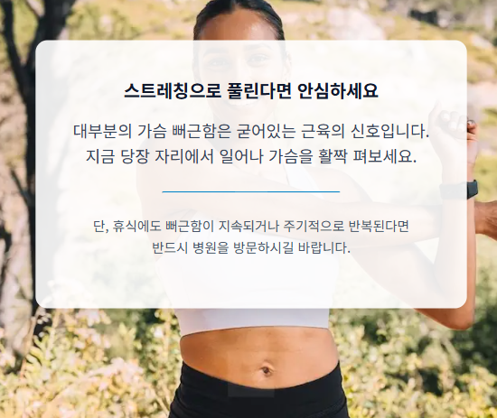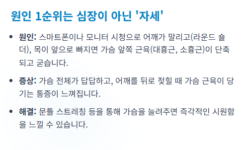 주요 증상: 가슴 전체가 뻐근하고 답답하며, 어깨를 뒤로 젖힐 때 가슴 근육이 당기는 느낌이 들어요. 다행히 이는 질환이 아니므로 문틀을 잡고 가슴을 늘려주는 스트레칭만으로도 즉각적인 시원함을 느낄 수 있답니다.