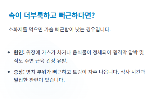 증상 특징: 명치 윗부분과 왼쪽 가슴에서 타는 듯한 느낌, 쓰린 느낌이 들며, 식사 후 바로 눕거나 구부린 자세를 취할 때 증상이 심해집니다.