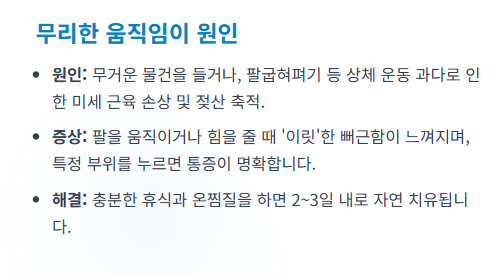 특징: 팔을 움직이거나 힘을 줄 때 특정 부위가 '이릿'하면서 아프고, 해당 부위를 누르면 통증이 느껴집니다. 충분한 휴식과 온찜질로 2~3일 내 자연 치유가 가능해요.