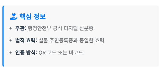 모바일 주민등록증은 행정안전부에서 공식 발급하는 디지털 신분증이에요. 플라스틱 카드형 실물 주민등록증과 법적으로 완전히 동일한 효력을 가지고 있답니다.