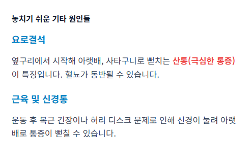 | 국소적으로 아픈 통증 | 게실염, 난소 문제, 요관 결석 | 눌렀을 때 심한 압통 |