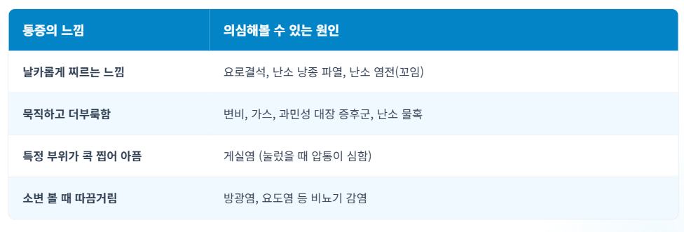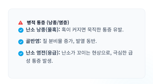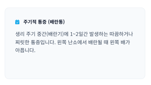 | 찌르는 듯한 통증 | 난소낭종, 난소 염전, 요로결석, 급성 장염 | 갑작스러운 발생, 심한 통증 |