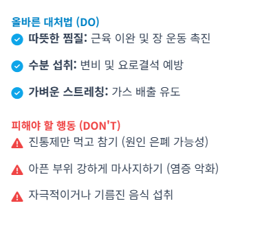 가벼운 통증이라면 따뜻한 찜질과 충분한 수분 섭취가 도움이 돼요. 가벼운 스트레칭으로 장운동을 촉진하고, 규칙적인 식사와 장을 자극하지 않는 음식을 섭취하는 것이 좋답니다.