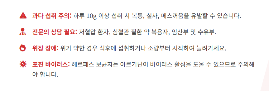 아르기닌은 일반적으로 안전하지만, 저혈압이나 심혈관 질환 약을 복용 중인 경우, 임신이나 수유 중인 경우, 소화불량이나 위염이 잦은 경우에는 전문의 상담이 필요해요.