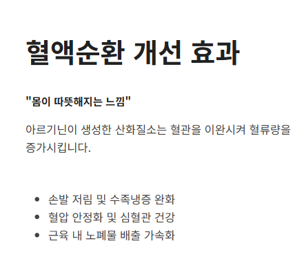 아르기닌이 주목받는 가장 큰 이유는 혈류 개선 효과예요. 체내에서 생성된 산화질소는 혈관을 이완시켜 혈압을 낮추고 혈액순환을 개선합니다. 심혈관 문제가 있는 사람들의 혈류를 개선하는 데 자주 사용되며, 손발 저림이나 냉증 완화에도 효과적이에요.