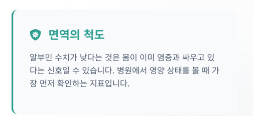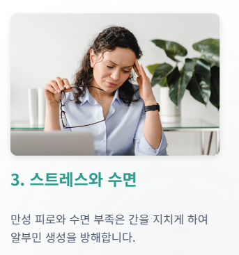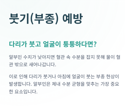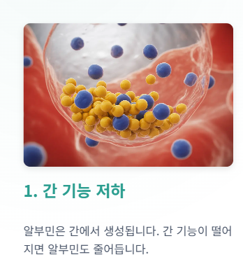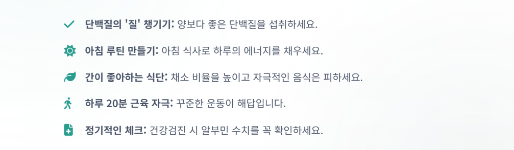 | 간 건강 관리 | 음주 자제, 정기 간 기능 검사 | 알부민 합성 능력 유지 |