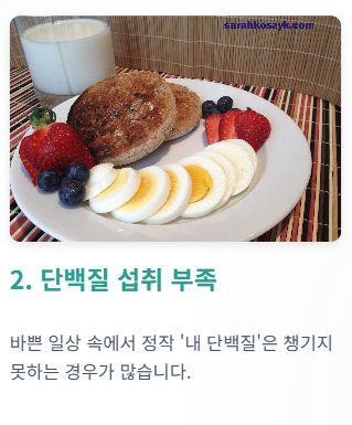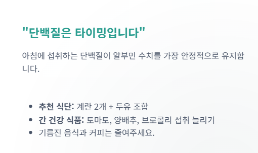 | 고품질 단백질 섭취 | 육류, 생선, 달걀, 유제품, 콩류 규칙적 섭취 | 알부민 생성 원료 공급 |
