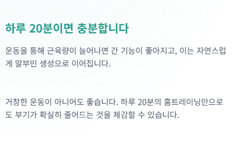 | 적절한 운동 | 하루 20분 이상 유산소 운동 | 근육량 증가, 간 기능 향상 |