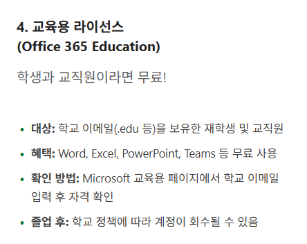 학교 이메일 주소만 있으면 신청할 수 있어요. Microsoft 교육용 페이지에서 학교 이메일을 입력하고 인증받으면 끝이에요. 졸업하기 전까지 제한 없이 사용할 수 있답니다.