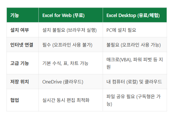 제 의견으로는, 엑셀을 처음 무료로 사용해보시는 분들께는 웹 버전이 가장 좋아요. 설치도 필요 없고, 평생 무료로 사용할 수 있거든요.