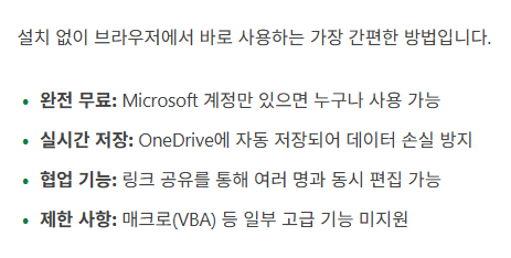 물론 완벽한 방법은 아니에요. VBA 매크로나 피벗 테이블 고급 기능 같은 전문적인 작업에는 제한이 있어요. 또 인터넷이 연결되어 있어야 한다는 점도 참고하셔야 해요.
