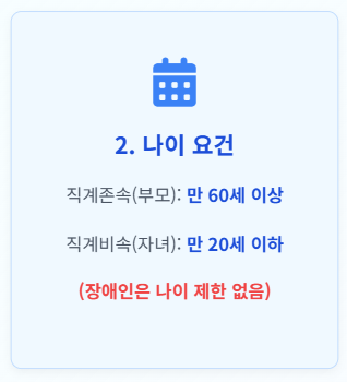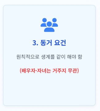 • 동거 불필요: 배우자, 자녀(직계비속)는 주소지에 상관없이 생계를 같이 하는 것으로 간주되어 동거 요건을 따지지 않습니다.