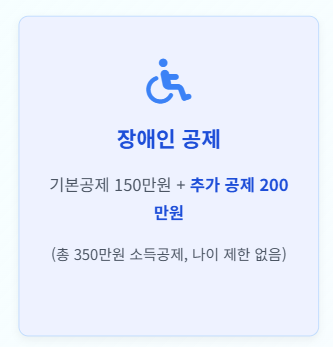• 장애인 추가공제: 기본공제 대상자 중 장애인인 경우, 200만 원을 기본공제 외에 추가로 공제받습니다. (나이 제한 없음)