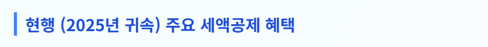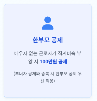 • 한부모 공제: 배우자가 없는 자로서 기본공제 대상 직계비속 또는 입양자가 있는 경우 연 100만 원 공제.