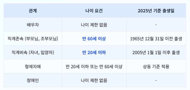 직계존속 (부모, 조부모) 만 60세 이상 1965년 12월 31일 이전 출생자