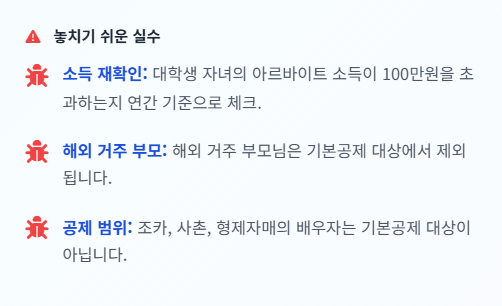 • 소득 재확인: 대학생 자녀의 아르바이트 소득이나 부모님의 임시 소득이 소득금액 100만 원(근로소득만 있을 시 총급여 500만 원)을 초과하는지 연간 기준으로 재확인해야 합니다.