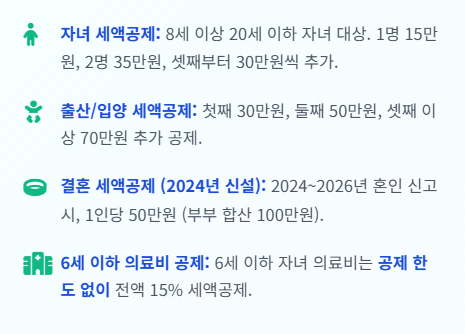 • 출산·입양 세액공제: 해당 과세기간에 출산/입양 신고 시 첫째 30만 원, 둘째 50만 원, 셋째 이상 70만 원을 추가로 공제받을 수 있습니다.