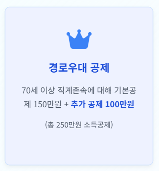 • 경로우대 공제: 기본공제 대상자 중 만 70세 이상(1955년 12월 31일 이전 출생)인 경우, 1인당 100만 원을 기본공제(150만 원) 외에 추가로 공제받습니다.