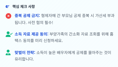 • 부모님 공제 협의: 형제자매 간 부모님에 대한 공제는 반드시 사전에 협의하여 한 명만 공제받도록 해야 합니다.