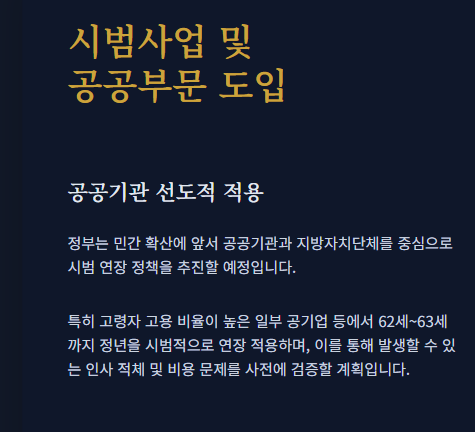 정부 방침에 따라 가장 먼저 시행될 예정이에요. 일부 공공기관은 이미 2025년부터 자체적으로 도입을 시작했답니다. 행정안전부 소속 공무직 2,300명의 정년을 65세로 먼저 연장한 사례가 있어요.