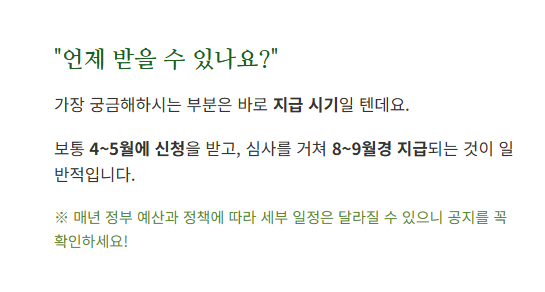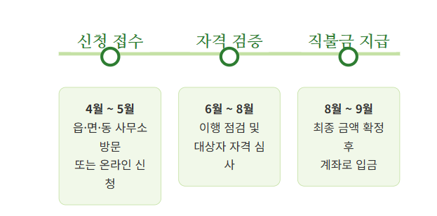 즉, 2월부터 4월까지 신청하시면 11월부터 직불금을 받으실 수 있어요. 신청부터 지급까지 약 7~9개월 정도 소요되니 참고하세요.
