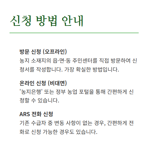 신규 신청자, 경영정보 변경자, 관외 경작자는 관할 읍·면·동 행정복지센터를 방문해서 신청하셔야 해요. 농지가 여러 곳에 있다면 면적이 가장 넓은 지역의 행정복지센터에 가시면 됩니다.