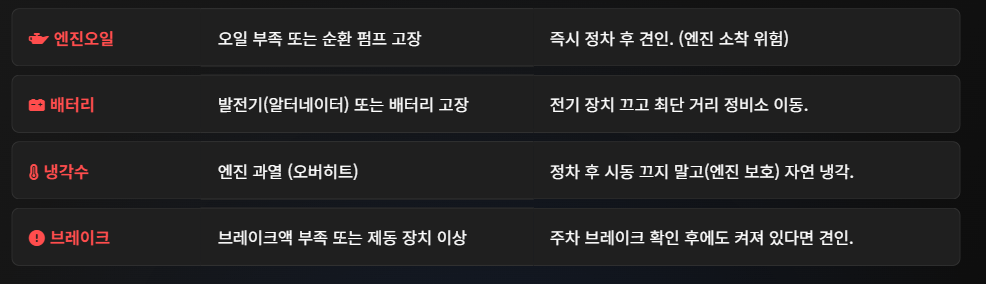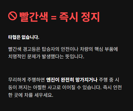 다음은 주행 중 점등되면 즉시 시동을 꺼야 하는 가장 치명적인 빨간색 경고등 세 가지입니다.