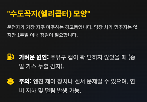 엔진 제어 시스템에 오류가 발생했음을 알립니다. 원인이 매우 다양하며, 배기가스 센서나 엔진의 미세한 오작동이 원인일 수 있습니다. 특이하게도 주유구 캡이 완전히 닫히지 않았을 때도 점등되는 경우가 많습니다. 만약 경고등이 켜진 상태에서 차량의 출력 저하나 심한 떨림이 없다면 정비소까지 운전해서 가도 되지만, 우선 주유구 캡을 다시 한번 딸깍 소리가 날 때까지 닫아보고 증상이 사라지는지 확인해 보는 것이 좋습니다.