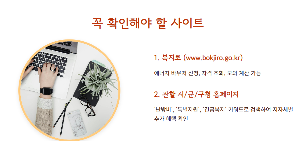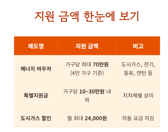 에너지바우처: 1가구당 겨울철 약 27.6만원~69.3만원까지 지원되며, 도시가스, 전기, 연탄, 등유 등 다양한 난방 수단에 사용할 수 있어요.