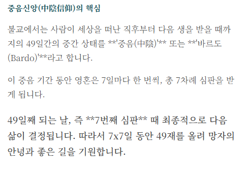 불교에서는 사람이 세상을 떠난 후 곧바로 환생하는 게 아니라 중유(中有)라는 전이 상태에 머문다고 봐요. 이 기간 동안 7일마다 한 번씩 총 7번의 심판을 받으며, 마지막 49일째에 최종 심판을 받아 다음 생이 결정된다고 믿죠. 그래서 유가족들은 이 기간 동안 고인이 좋은 곳으로 갈 수 있도록 정성껏 재를 올리는 거예요.