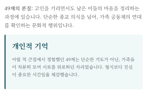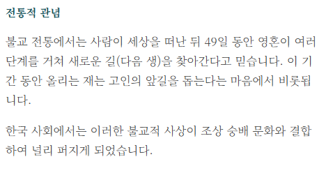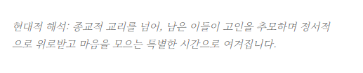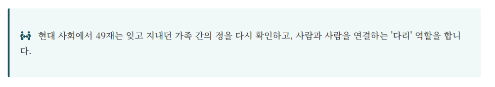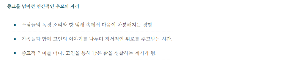 요즘은 종교적 의미를 떠나 고인을 추모하고 남은 가족들이 슬픔을 치유하는 시간으로도 받아들여지고 있어요. 가족들이 함께 모여 고인을 기억하고 서로를 위로하는 소중한 시간이 되는 거죠.