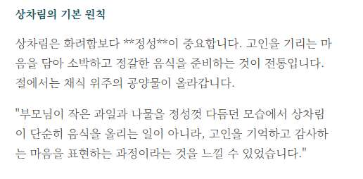 고인이 생전에 좋아하던 음식을 중심으로 상차림을 준비할 수 있어요. 두부전이나 채소전 같은 전 종류, 유과나 약과 같은 전통 과자, 호두·땅콩·밤 같은 견과류를 추가하는 것도 좋답니다. 최근에는 고인의 취향을 반영해 간소하게 준비하는 경우도 많아졌어요.