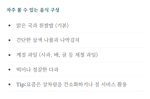 | 밥과 국 | 흰쌀밥, 맑은 채소국 또는 미역국 (고기나 해산물 제외) |
