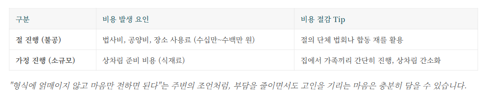 49재 비용은 절에 따라 차이가 있지만 일반적으로 300만 원에서 500만 원 정도예요. 법사비, 공양비, 영구위패 비용 등이 포함되는데, 절에서 일괄적으로 준비해 주는 경우가 많아요. 집에서 가족끼리 간소하게 진행하면 비용을 크게 줄일 수 있답니다. 여러 절의 비용과 서비스를 비교해보고, 공동 49재를 활용하는 것도 좋은 방법이에요.